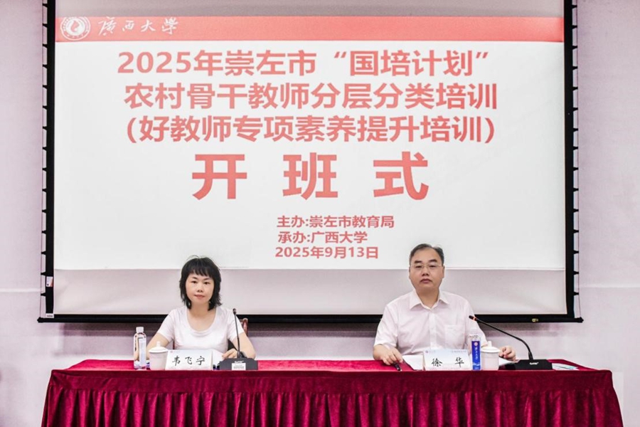 为深入贯彻落实国家关于新时代教师队伍建设改革的决策部署,提升崇左市教育系统教师的专业能力与综合素养,9月13日,由崇左市教育局统筹、广西大学承办的2025年崇左市“国培计划”农村骨干教师分层分类培训班(好教师专项素养提升培训班)在我校开班。广西大学继续教育学院副院长徐华出席开班式并讲话,广西大学继续教育学院副教授范小俊主持开班式。